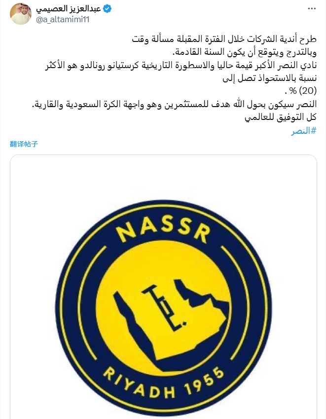 24 Live Network 8月1日,沙特記者Enterer Ellyaledi的記者報告說,羅納爾多現(xiàn)在擁有利雅得勝利的20。 記者說,公司俱樂部的成立只是未來的時間問題,并且正在逐步進行,預(yù)計將在明年完成。 利雅得勝利目前是最有價值的俱樂部,羅納爾多目前的股權(quán)比率最高,達到20。利雅得勝利將成為投資者的焦點,并成為沙特和亞洲足球的外墻。